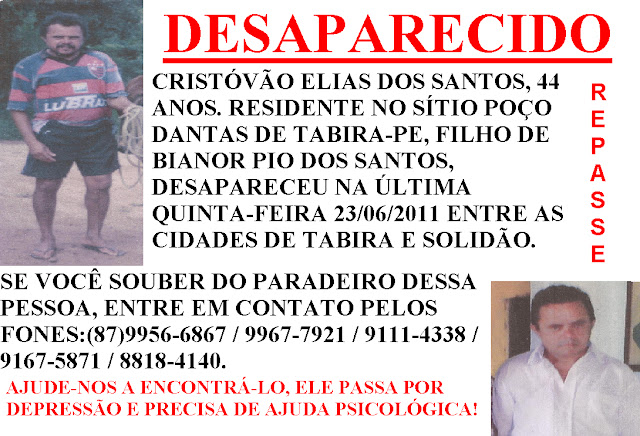 Atenção: Procura-se senhor desaparecido "Cristóvão Elias dos Santos de 44 anos"